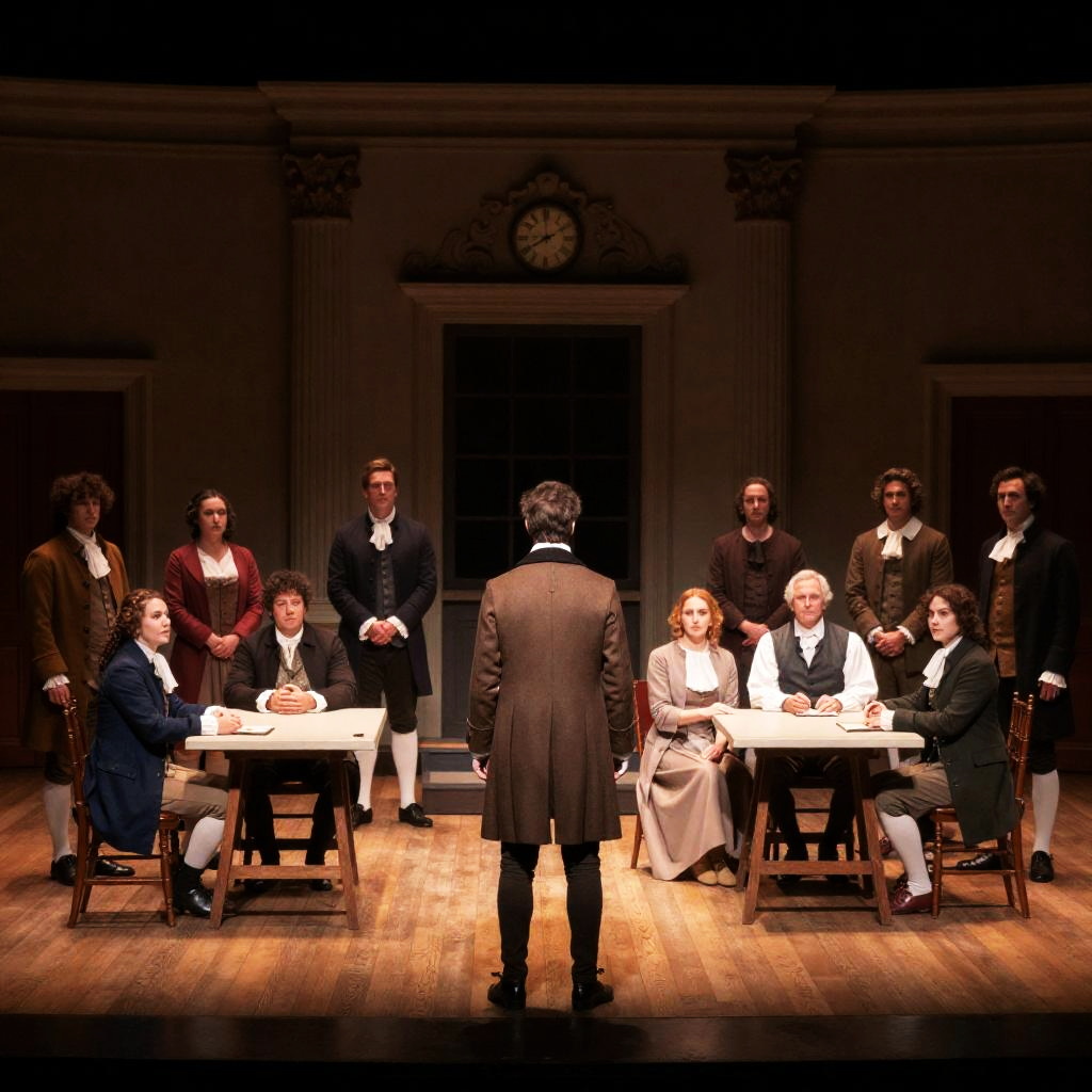 Photograph of a theater stage with 17 people in 18th-century attire. A man in a brown coat stands in the center, facing away. People sit at tables, some standing, in a dimly lit room with wooden floors and ornate wall panels. Background includes a clock and a large window. Faces are mostly neutral.