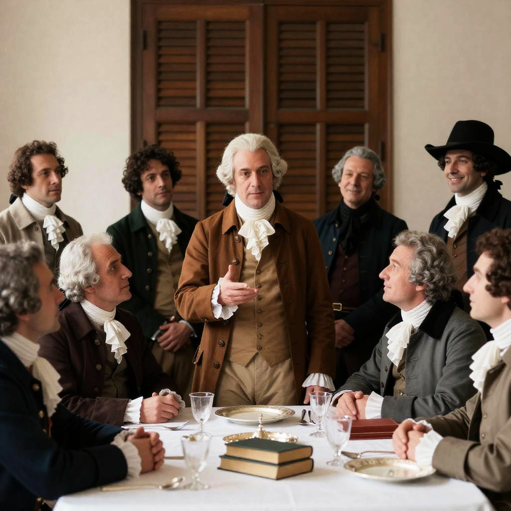 A group of 17 people dressed in 18th-century historical attire on a theater stage. The central figure, a man in a brown coat, stands with his back to the audience facing two tables where others are seated, while additional individuals stand behind them. The setting includes wooden floors, ornate wall panels with columns, a large window, and a clock above the window. The lighting is dim, emphasizing a period drama atmosphere.