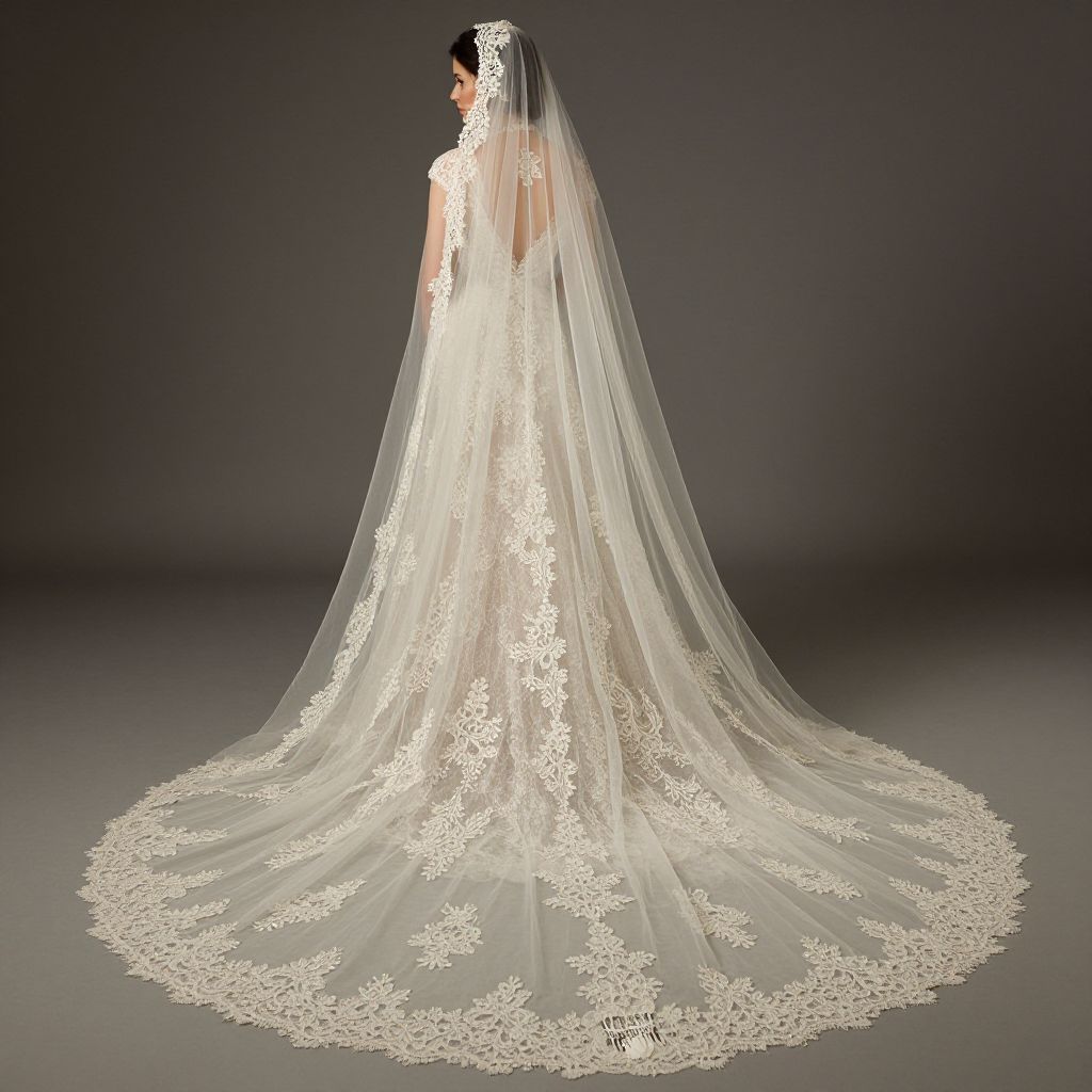 Elegant cathedral bridal wedding veil cascading gracefully from a woman's head, featuring a 3.5-meter length of ivory lace with a delicate edge and a lace comb accentuating its timeless design.
