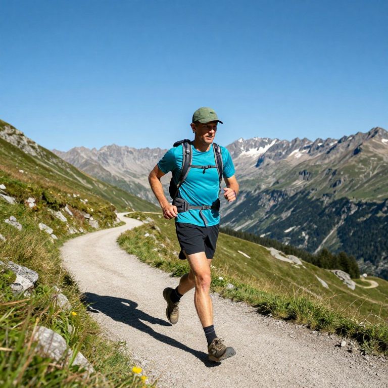 Photograph of a middle-aged man hiking on a narrow, gravel mountain trail under a clear, bright blue sky. He wears a blue athletic shirt, black shorts, black socks, and hiking shoes, with a green cap and a black backpack. His skin is light, and he is smiling. The trail curves to the left, surrounded by green grass and rocky terrain. In the background, majestic, snow-capped mountains rise against the sky. The sun casts sharp shadows, highlighting the textures of the trail and the rugged landscape. The image captures a sense of adventure and natural beauty.