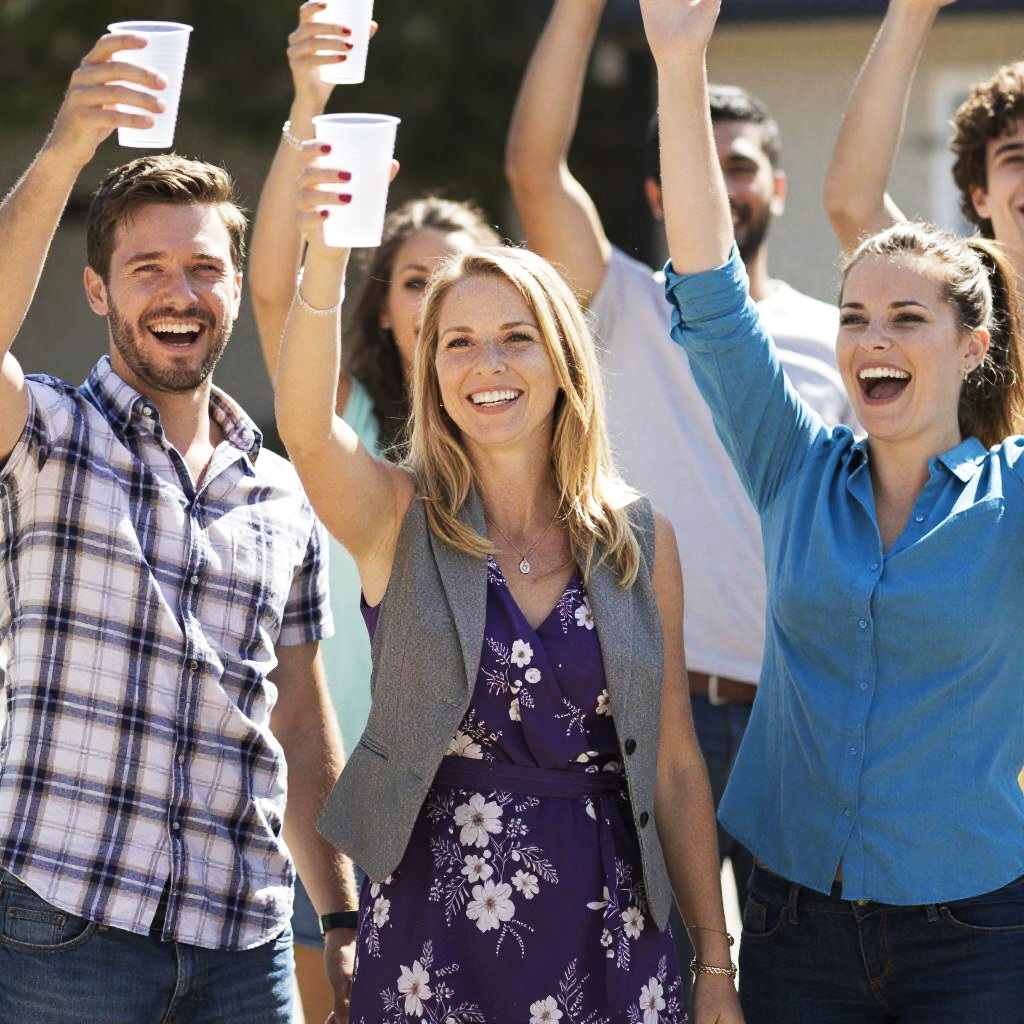 Outdoor performance. Guitarist in black suit with back to camera. Woman in gray dress and sandals, right foreground, arms crossed. Man in blue shirt and jeans, center, facing stage. Green trees in background. Wooden stage, microphone, guitar case. Casual crowd. Natural light.