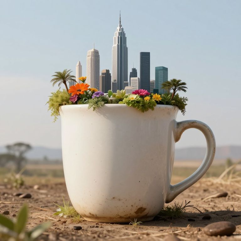 A colossal coffee mug, weathered by time, stands defiantly amidst a desolate landscape, its rim crowned with a vibrant garden and a miniature skyline of futuristic skyscrapers, defying the boundaries between the mundane and the extraordinary.