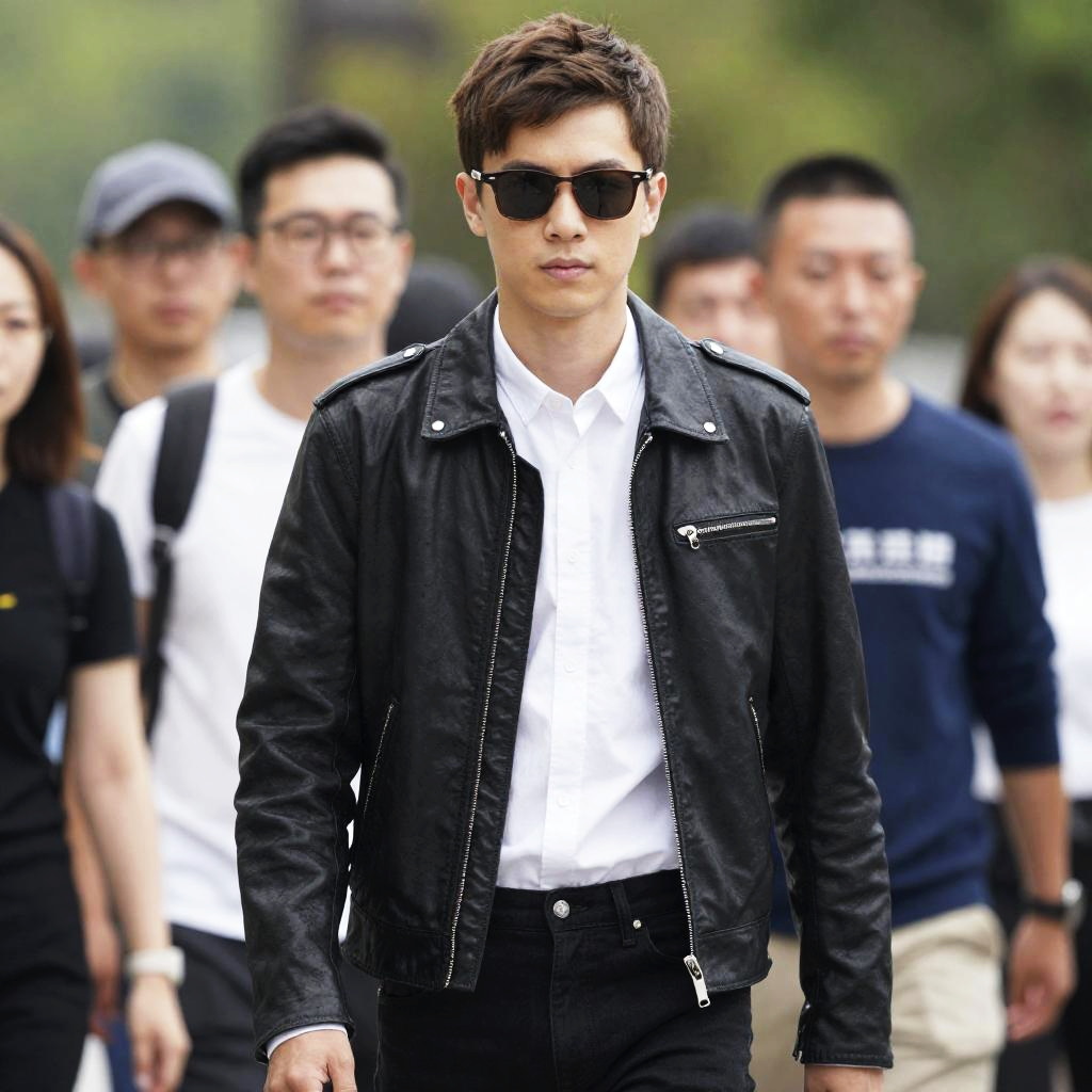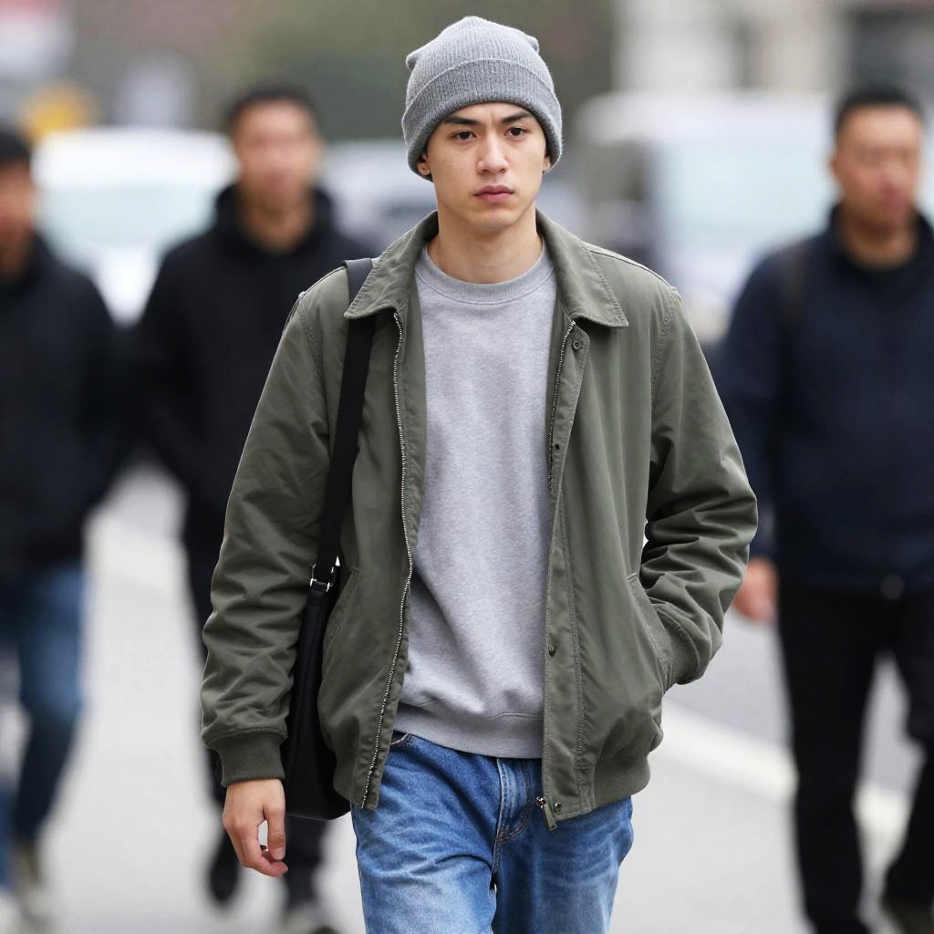 Photograph of a young man with light skin, wearing a gray beanie, gray sweatshirt, green jacket, and blue jeans. He has a neutral expression, left hand in pocket, right hand loose. Background includes blurred people and street. He carries a black bag over his left shoulder. Daylight. Urban setting.