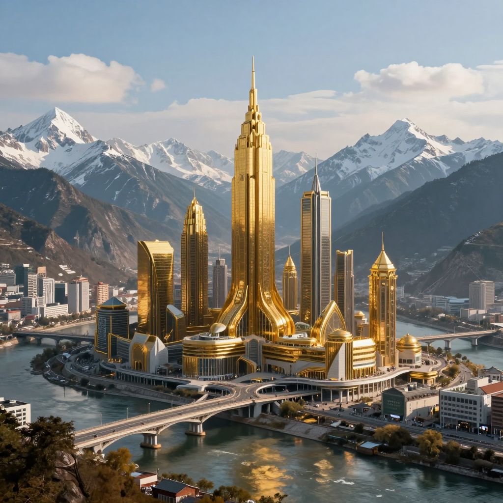Photograph of a futuristic cityscape featuring a cluster of skyscrapers with golden, reflective facades, reminiscent of the Guggenheim Museum Bilbao. The tallest building is a slender, spire-topped tower in the center. The buildings are surrounded by a river with a bridge connecting them. Snow-capped mountains rise in the background under a blue sky with scattered clouds. The city's modern architecture contrasts with the natural landscape, creating a striking visual. The golden buildings reflect sunlight, adding a shimmering effect to the scene. Urban elements, such as smaller buildings and roads, are visible in the foreground.