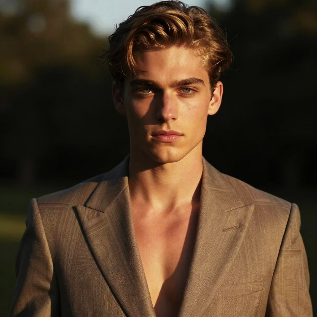Gigachad in a high fashion photoshoot style, sharp tailored suit, confident posture with piercing eyes, golden hour sunlight casting warm tones, intricate skin texture and perfect hair, realistic but enhanced aesthetics