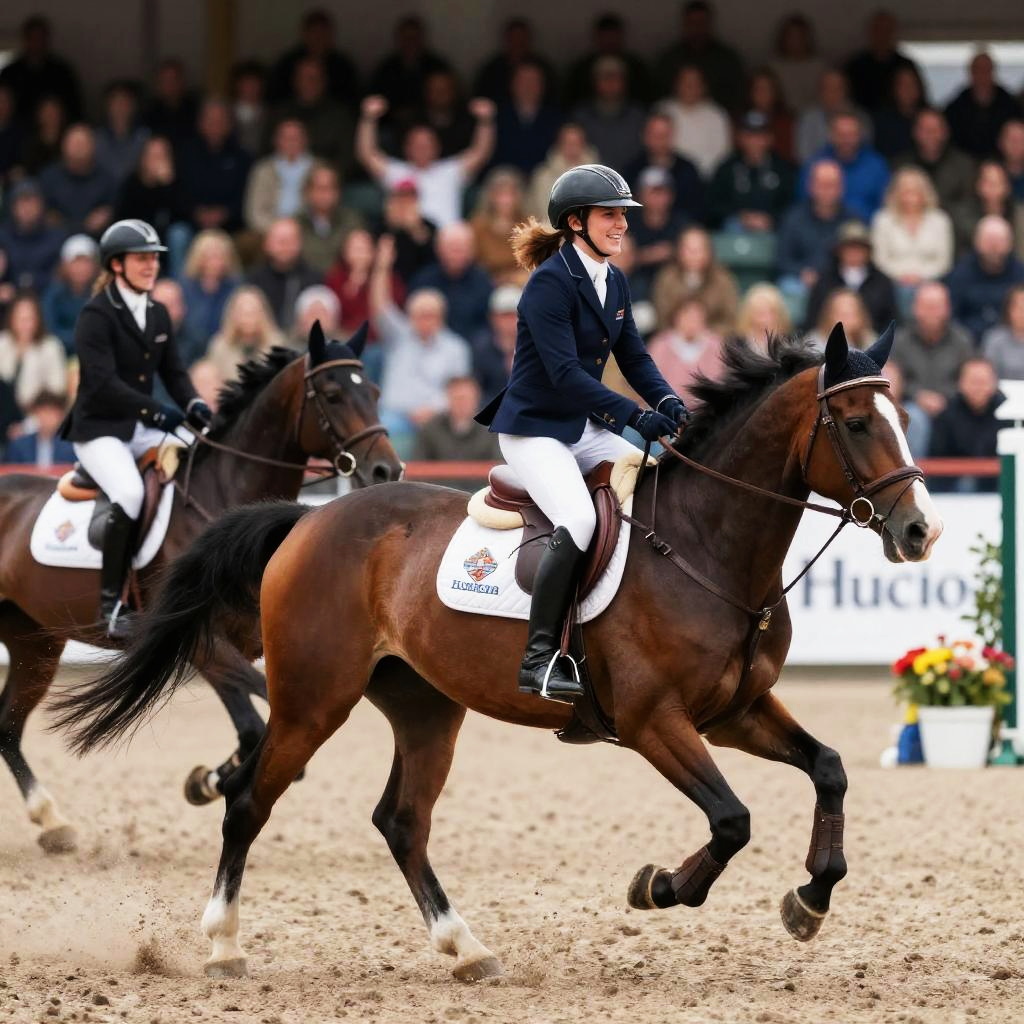 Step n Free Stables during a lively equestrian event, horses in motion, riders in elegant attire, dynamic movement, cheering crowd, outdoor arena, vivid colors, excitement and energy