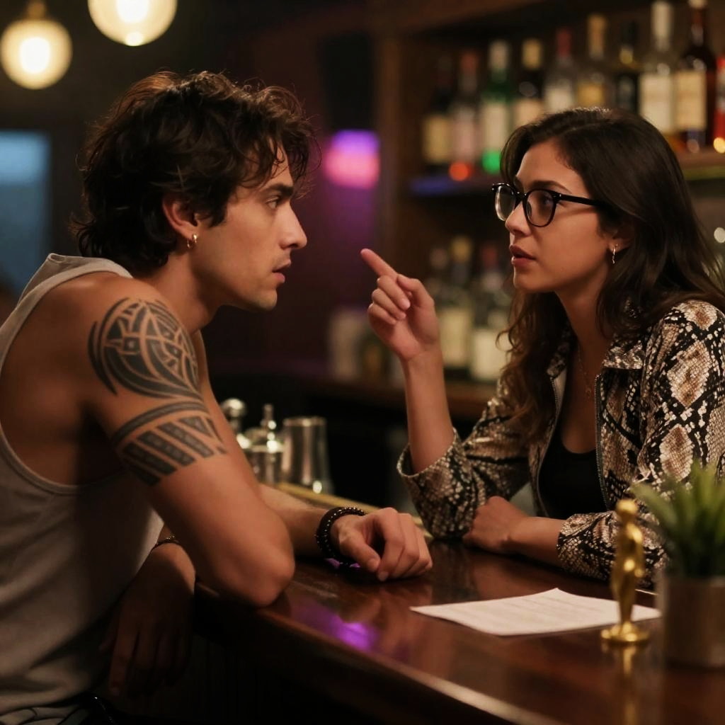 Photograph of two people at a bar. Man with dark hair, tribal arm tattoo, grey tank top, leaning forward. Woman with brown hair, glasses, snakeskin jacket, looking at him. Bar counter with small golden statue, green plant, paper. Background has colorful lights and shelves with bottles. Man's intense expression, woman's curious expression. Man's right hand extended, woman's left hand near his. Two people. Warm, dim lighting.