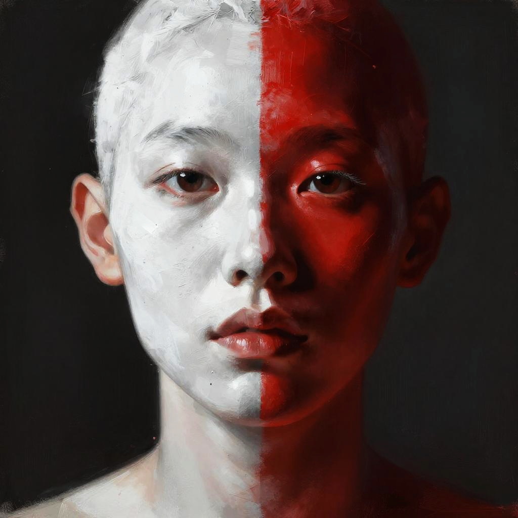This is a digital art piece featuring a surreal, head-and-shoulders portrait of a person with a painted face. The face is divided into white and vibrant red sections, with a thick red stripe running vertically down the center. The white parts have a textured, almost metallic look, while the red parts are smooth and glossy. The background is dark, making the colors pop. The person's expression is neutral, with slightly parted lips and calm eyes.