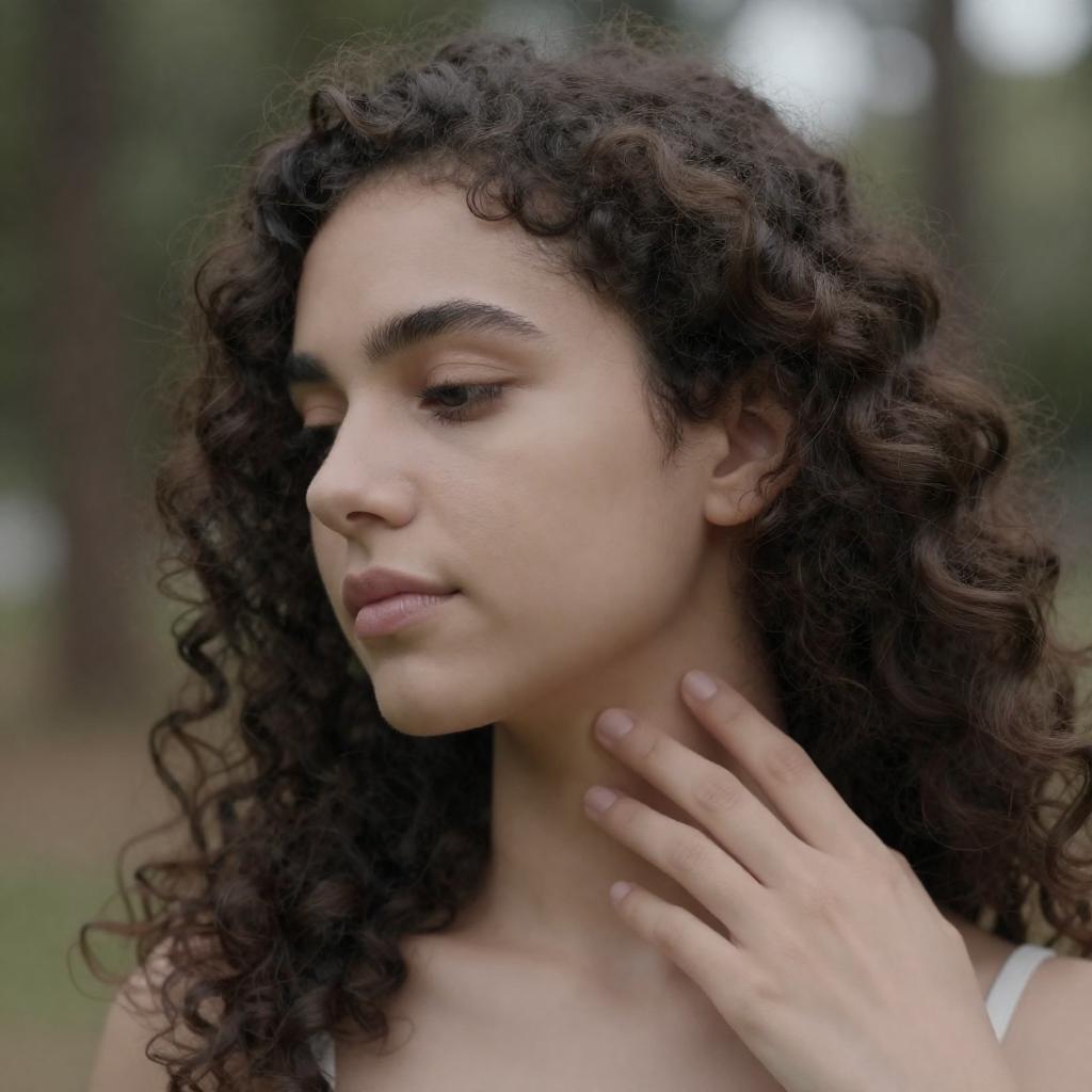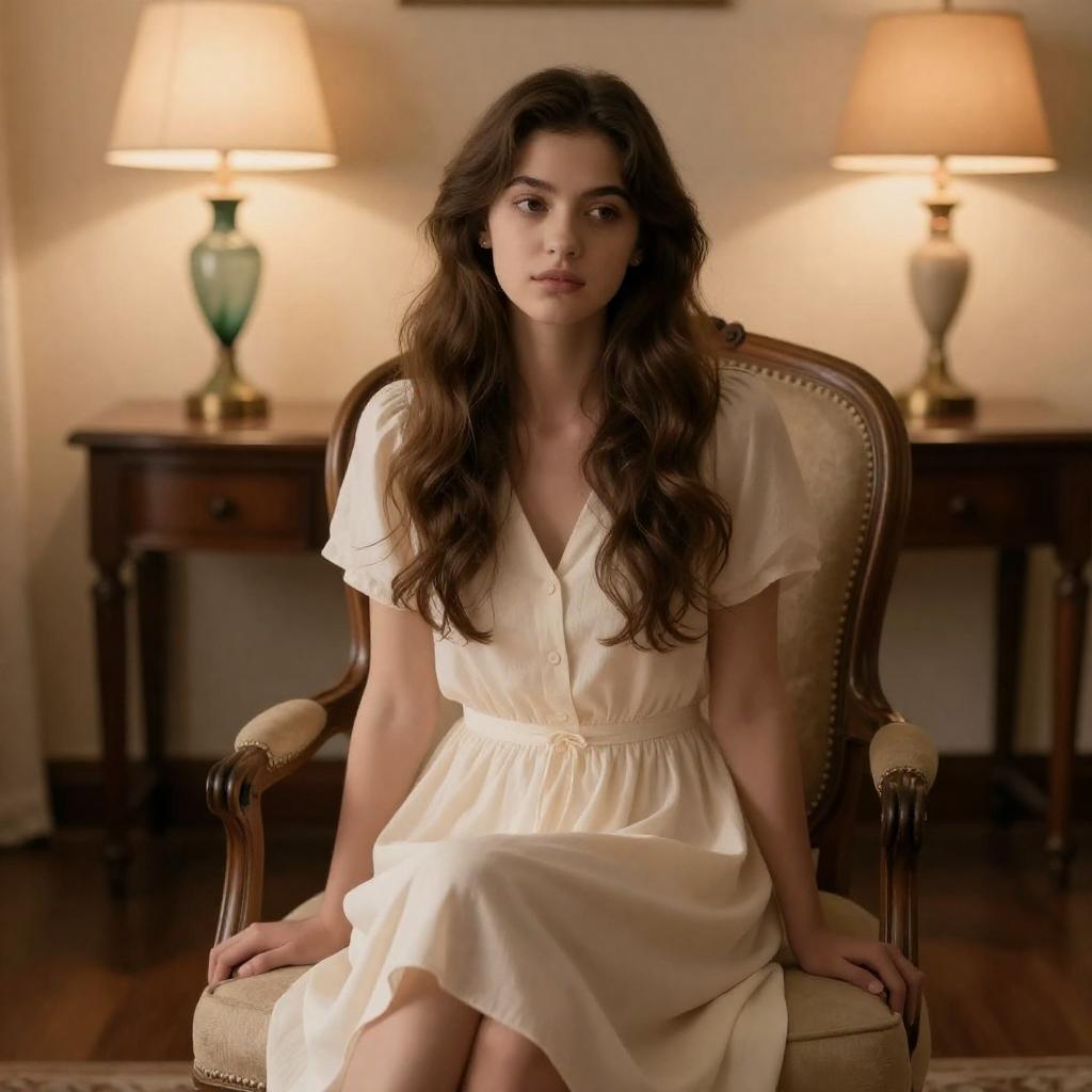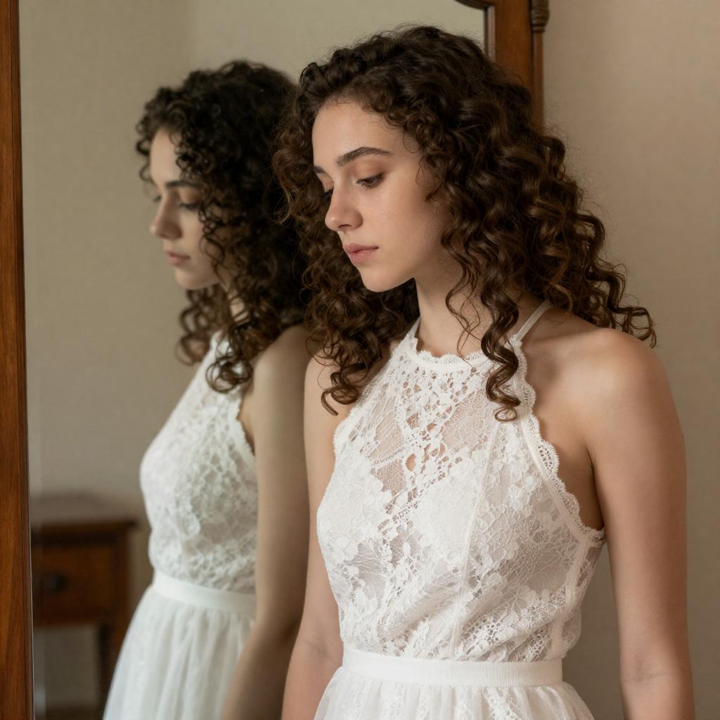 Young woman with curly brown hair in an elegant, white lace halter dress, standing near a wooden mirror. Soft light, reflective background. Side profile, downcast eyes, calm expression. Single person. Reflective mirror, wood furniture in background.