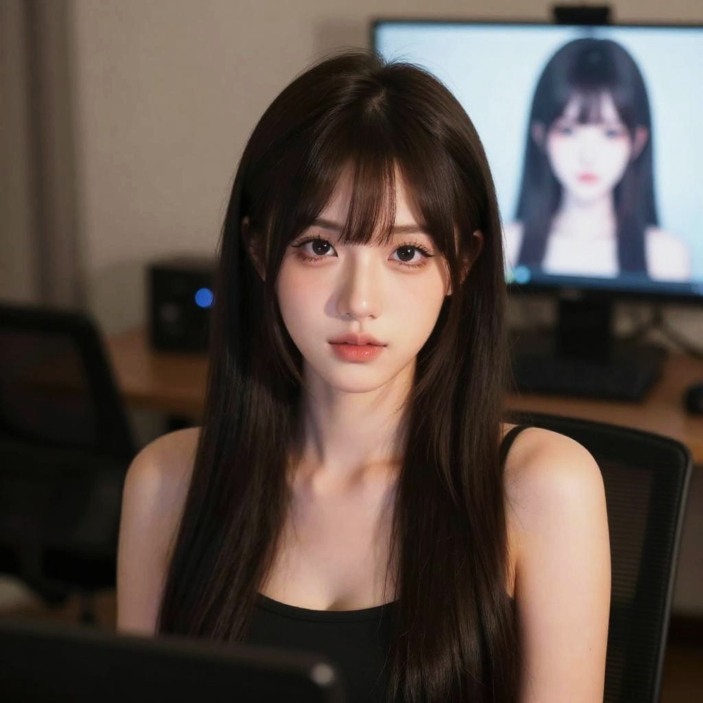 Vtuber real life concept, realistic portrait of a female streamer with anime-inspired features, virtual avatar blending with real environment, soft shadows, cinematic lighting