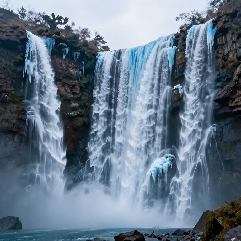 Photograph of a powerful waterfall cascading down a dark, rocky cliff, with icy blue highlights, surrounded by mist and sparse trees.