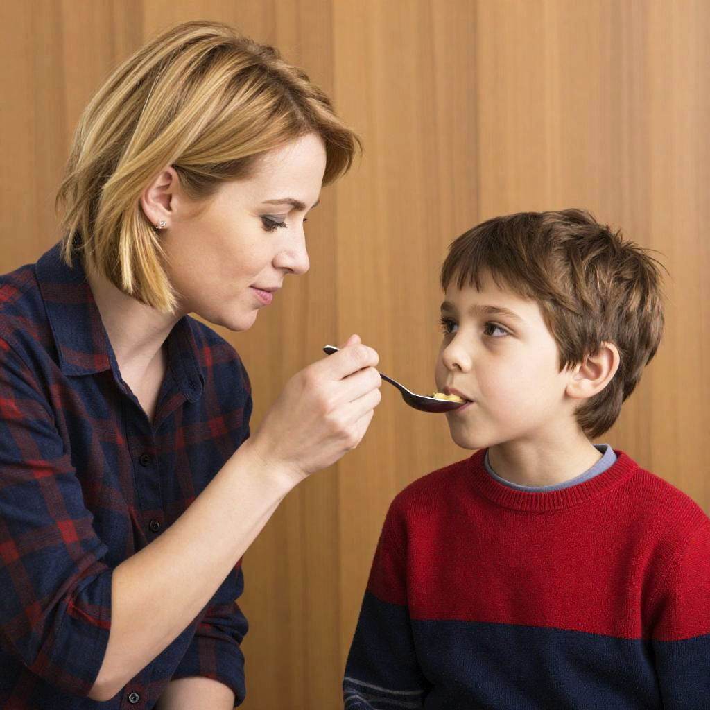 A man with short dark hair wearing a blue checkered shirt leans close attentively as a young blonde boy in denim overalls and a white t-shirt drinks from a white cup with a pink design while sitting at a wooden table. The background features a blurred window and a red-and-white checkered wall.