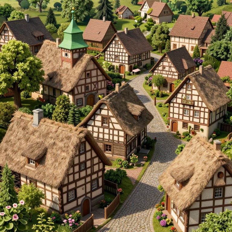 Whimsical CGI village featuring quaint, timber-framed houses with thatched roofs, winding cobblestone streets, lush greenery, and colorful flower