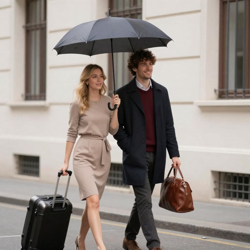 Couple Walking on City Street with Umbrella and Luggage