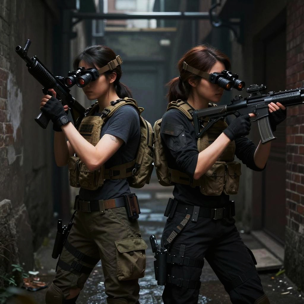 Digital art of two female soldiers in tactical gear and black sunglasses, holding rifles, walking through a dark, narrow, urban alley.