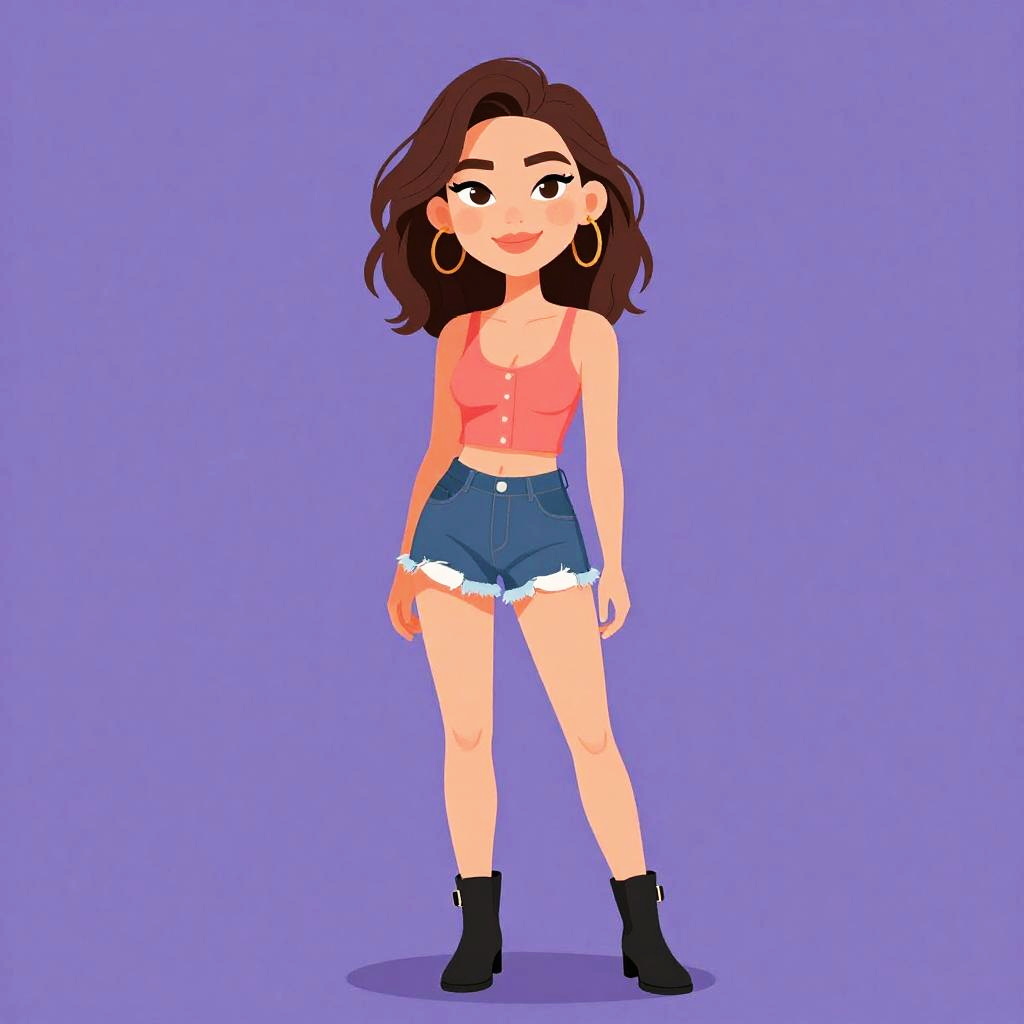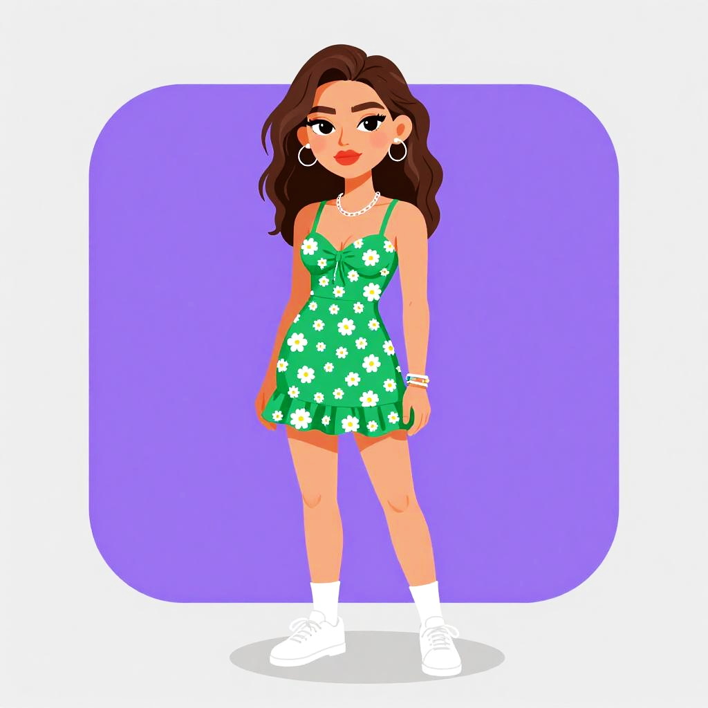 Illustration of a young woman with medium skin tone and long wavy brown hair wearing a casual green mini dress with white floral print, scoop neckline, thin straps, and ruffled hem. She accessorizes with silver hoop earrings, a silver chain necklace, stacked mixed metal bracelets, white crew socks, and simple white sneakers. The background is a neutral gray with a purple rounded rectangle shape behind the subject.