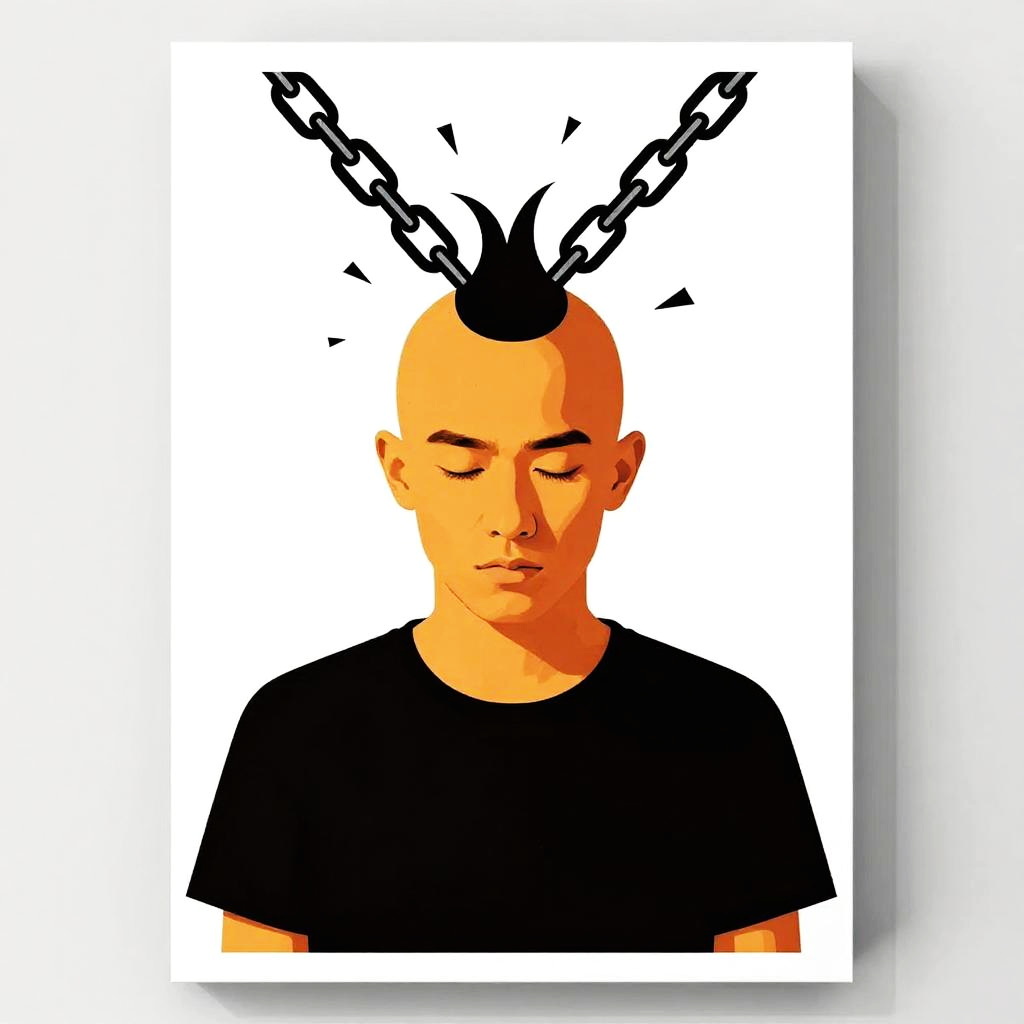 Make someone bald, a stylized graphic poster of a bald person breaking free from chains symbolizing hair, bold colors, strong contrast, minimalist background, powerful and empowering visual storytelling.