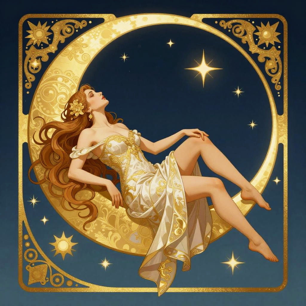 Elaborate border, Beautiful woman in flowing dress laying reclined sensually on a large crescent moon with a background of stars, night sky background, blues and gold, good anatomy, dynamic pose, good proportions, modern style, vector, highly detailed, intricate, masterpiece, realistic, professional, Dark Fantasy, d&d Elder Scrolls Diablo III, (centered), (well framed), vector-art, gradient color, detailed, professional art masterpiece, (Art Nouveau), Illustration by Alphonse Mucha, (vector-art:1.1)Negative prompt