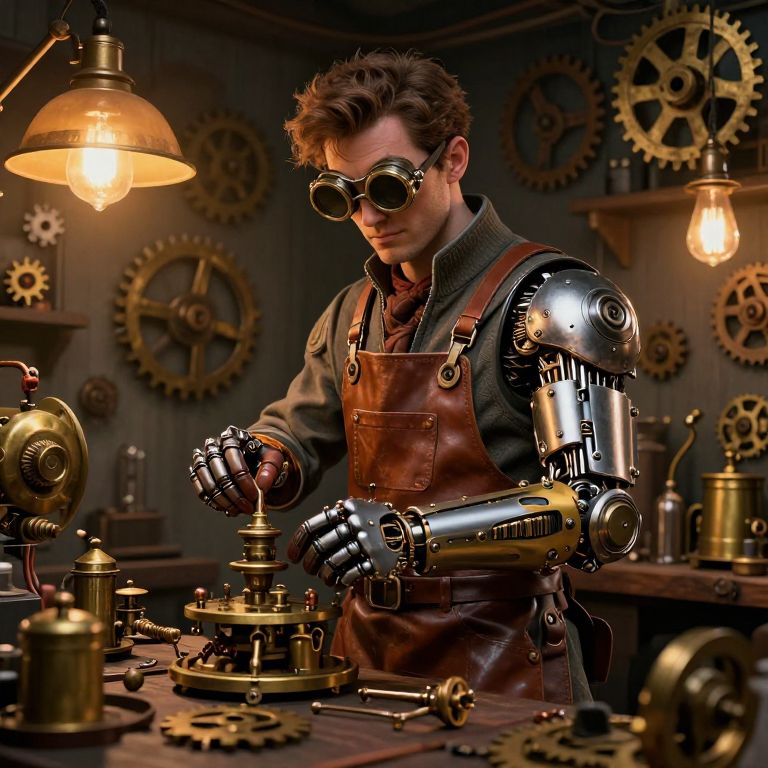 Characterd illustrated as a steampunk inventor in a cluttered workshop filled with gears, cogs, and brass instruments, wearing goggles and leather apron, detailed mechanical arm enhancements, warm light from vintage lamps creating a cozy atmosphere.