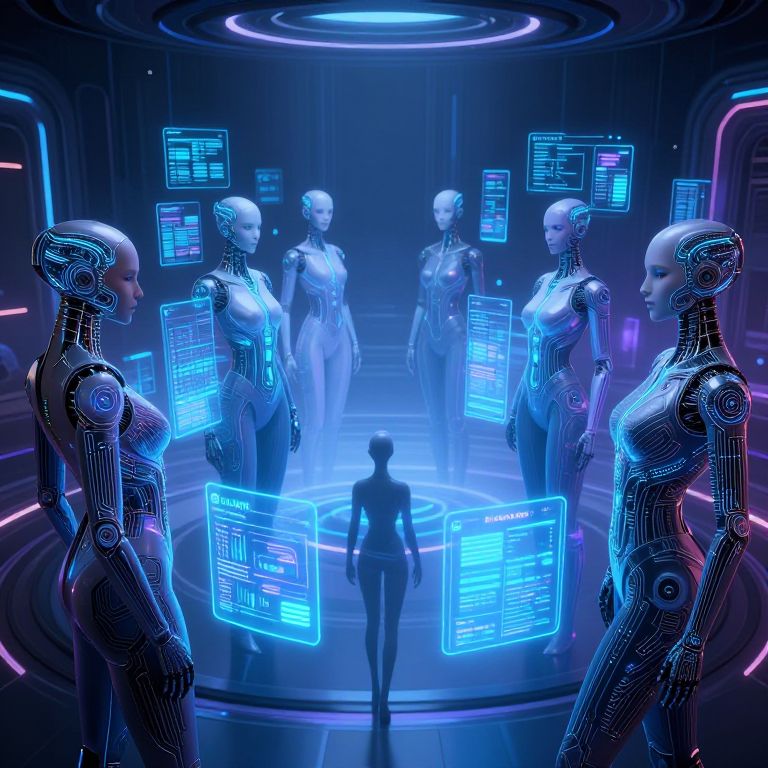 A digital CGI image in a futuristic sci-fi style depicts a glowing blue-lit room with six humanoid robots with sleek, metallic bodies and illuminated circuitry. The robots, with female physiques and varying breast sizes, stand in a semi-circle facing a central, silhouetted human figure. Floating holographic screens display data and text in bright blue and white. The background features curved, neon-lit walls, adding a high-tech ambiance. The robots have smooth, polished surfaces with visible joints and wiring, enhancing their robotic appearance. The overall atmosphere is cybernetic and futuristic.