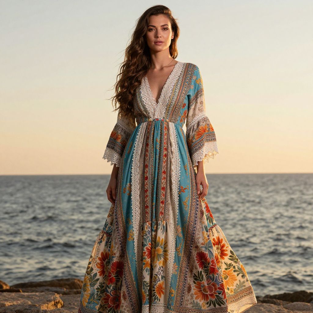 A woman stands gracefully by the sea during sunset, wearing a flowing bohemian-style dress with intricate floral patterns and lace details. The warm sunlight highlights her long, wavy hair and the vibrant hues of the dress, creating a serene and picturesque coastal scene.