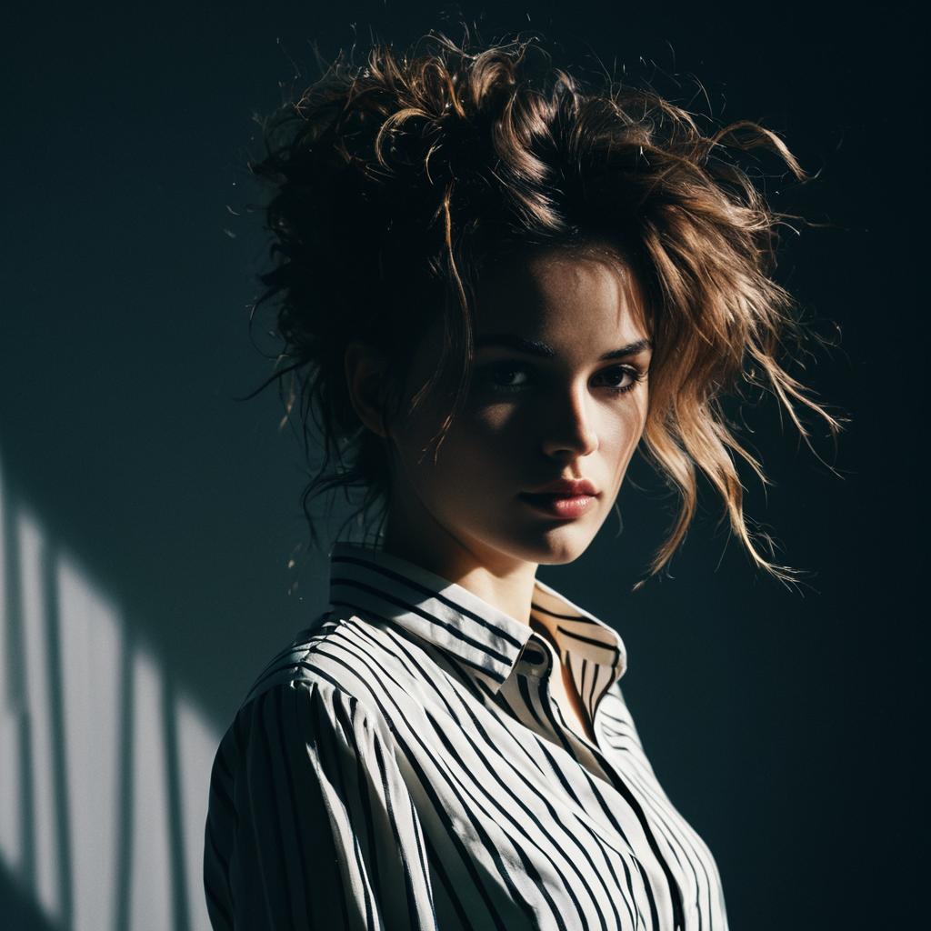 Portrait of a young woman with messy, voluminous hair wearing a modern, white blouse with black stripes. The photo is taken in a studio setting with dramatic spotlight creating shadows, showcasing a fashion editorial style.