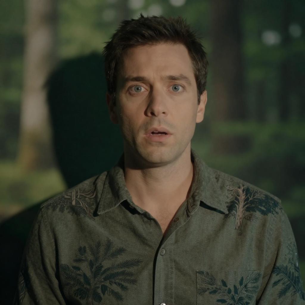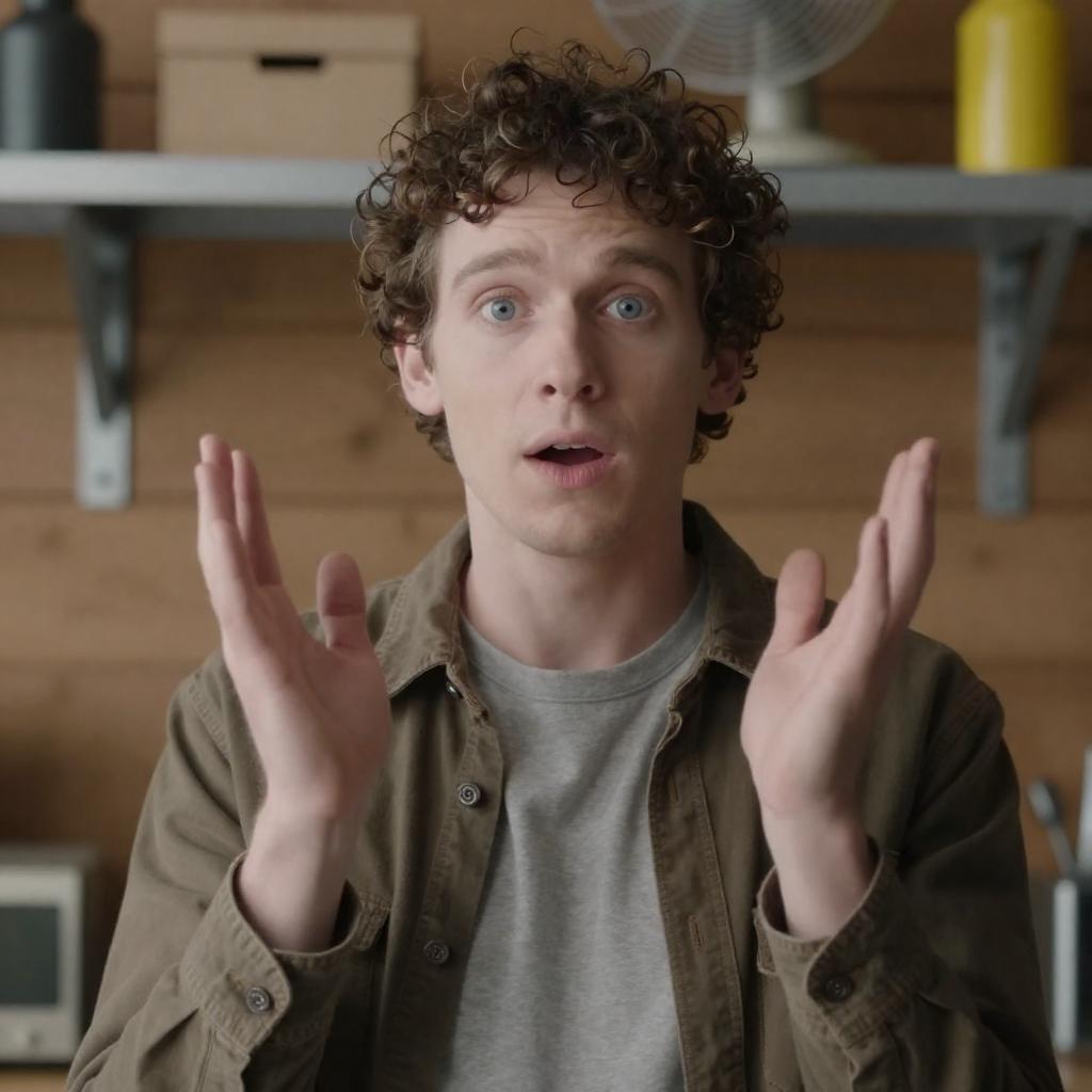 Photograph of a man with light skin and brown hair, wearing a blue shirt, green jacket, and brown vest, with hands raised in front of him, mouth open in a surprised expression. Sky with clouds in the background.