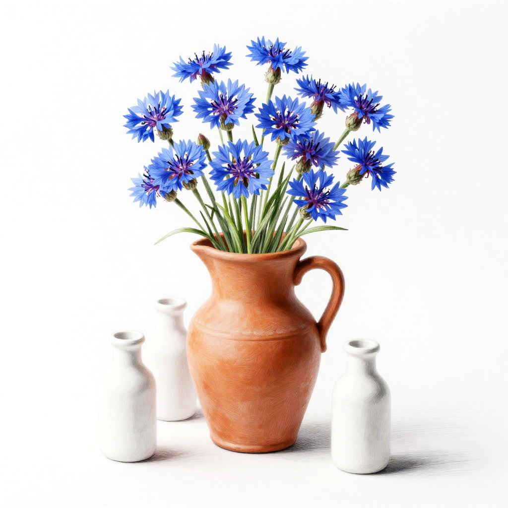 A soft pastel pencil sketch featuring a rustic terracotta jug holding a cluster of delicate blue cornflowers, on a seamless white background with three small empty white bottles nearby; high contrast, bold accent colors, thin clean lines, balanced composition, generous negative space, soft studio lighting, modern minimalist aesthetic, crisp edges, no text, no watermark