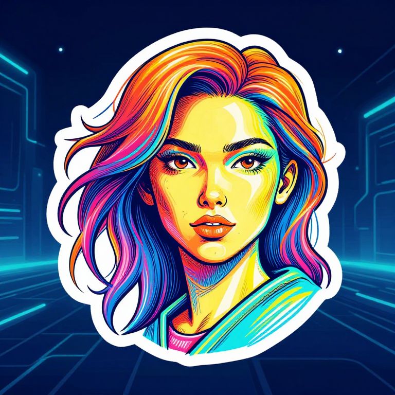 Digital pop art portrait of a woman with colorful, rainbow-streaked hair, neon blue and purple highlights, set against a glowing, futuristic grid background