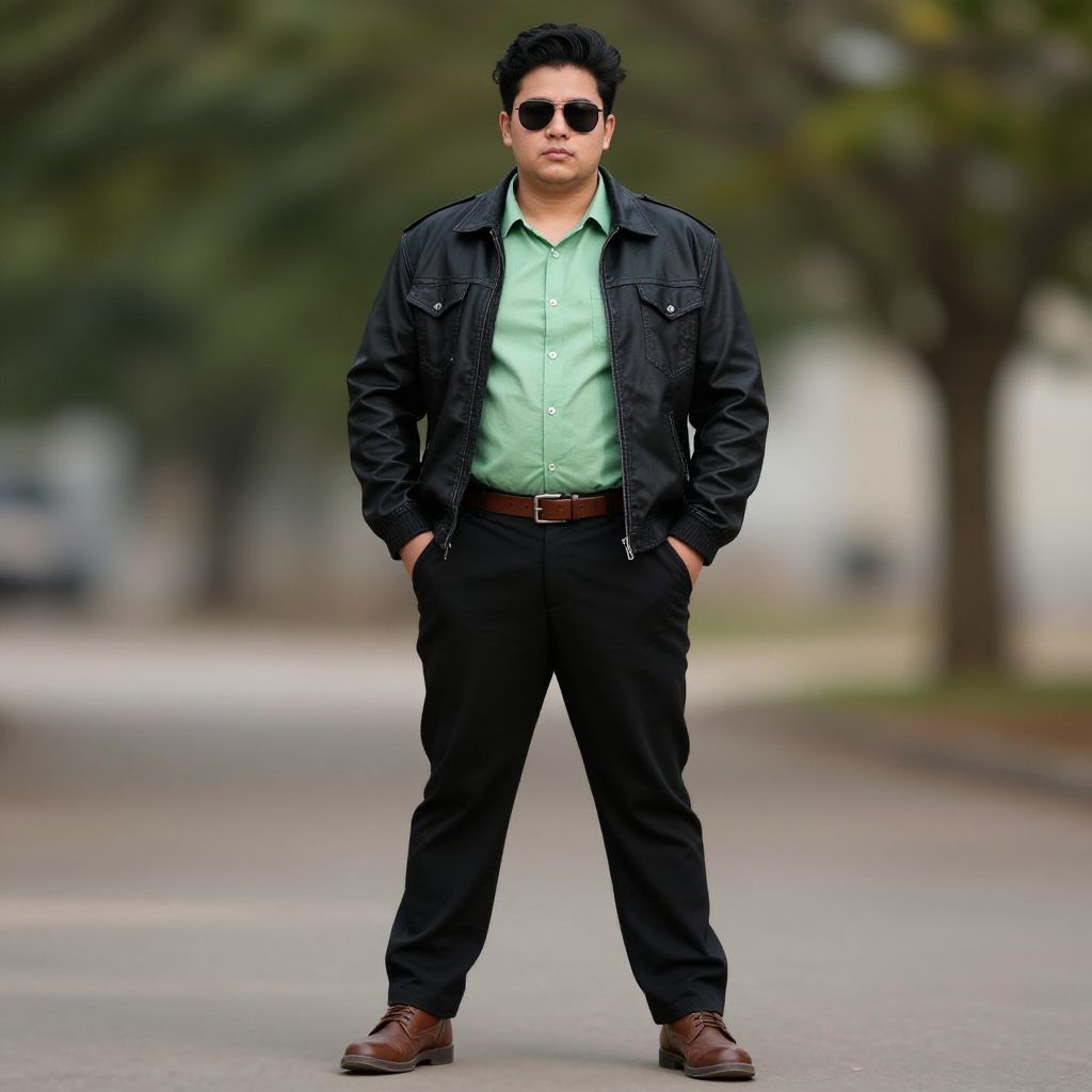 "gentlemen outfit costume, 1boy, male focus, solo, jacket, hands in pockets, pants, denim, facial hair, shirt, jeans, black hair, full body, outdoors, belt, plant, standing, brown jacket, potted plant, mustache Realistic photo of casual sexy person with pretty face"