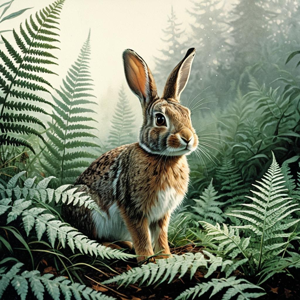 Vintage-style illustration of a young, curious rabbit with large ears and wide eyes sitting on the ground covered with golden fallen leaves. The rabbit's fur is detailed with brown and white tones, highlighting a gentle and innocent expression.