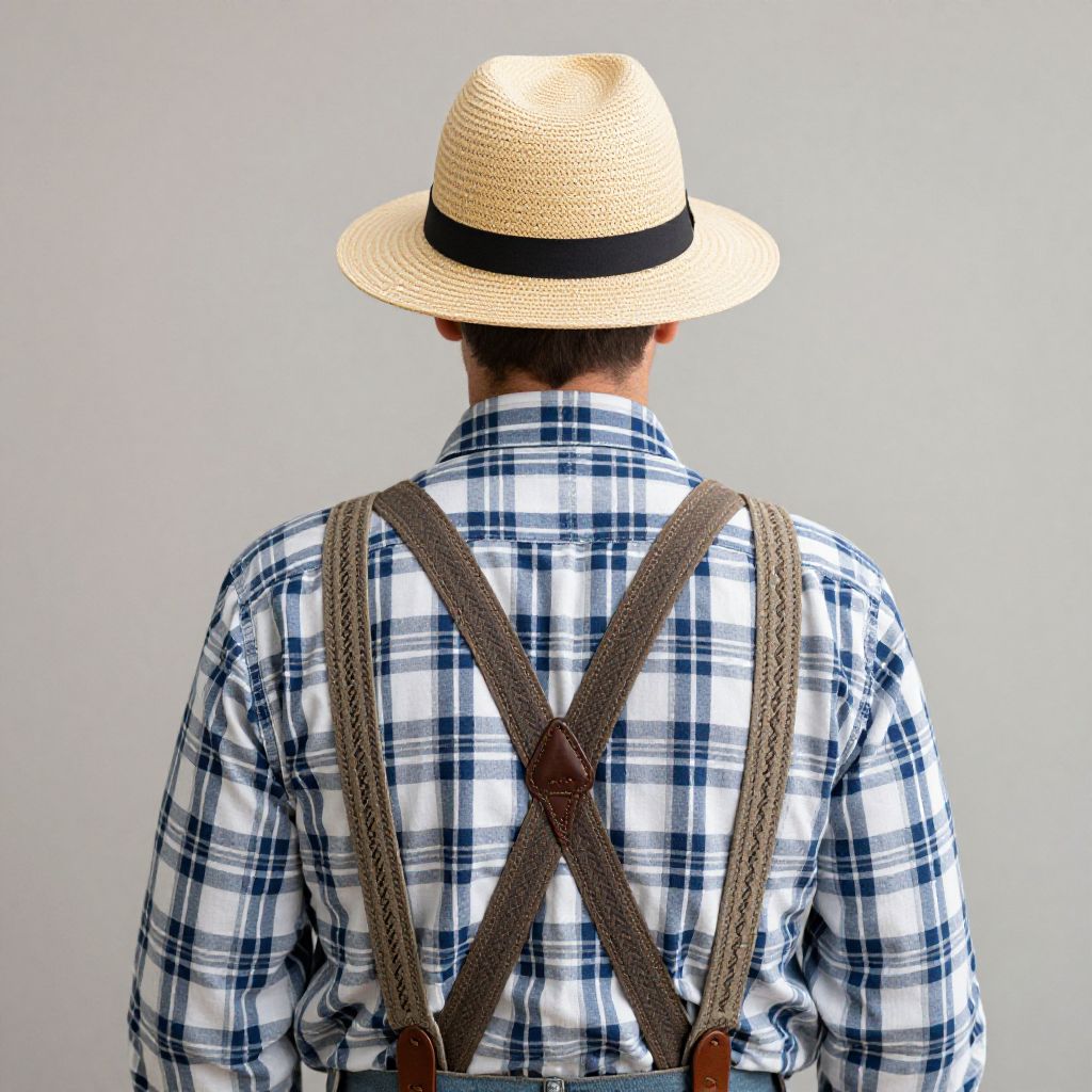 Photograph of a man from behind wearing a straw hat, blue and white plaid shirt, brown suspenders, against a plain white background.
