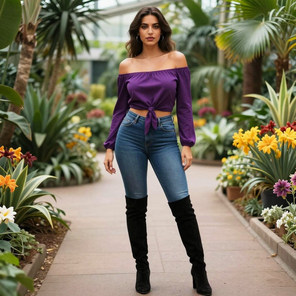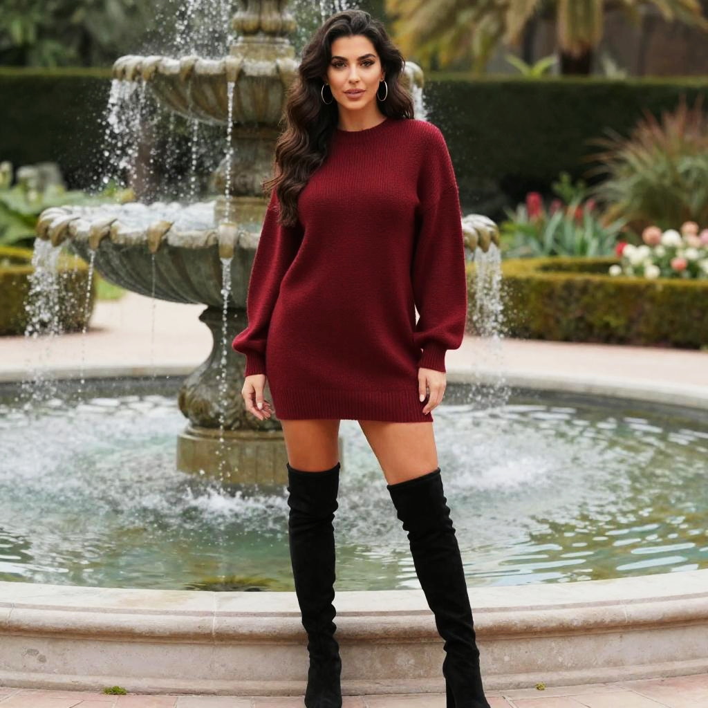 A busty woman in a casual chic oversized deep red sweater dress, paired with black over-the-knee suede boots, hoop earrings, and long wavy hair, stands by a botanical garden water fountain, captured in the vibrant visual style of Mappa Studio. Sexy. Pretty face and beutiful eyes