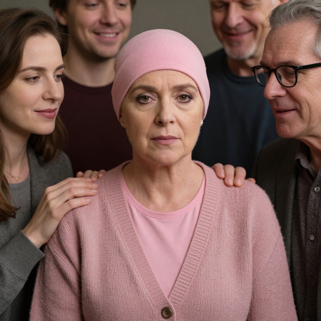 Extravagant woman with cancer surrounded by beloved people, ultra detailed, sony A7R, photorealistic,
