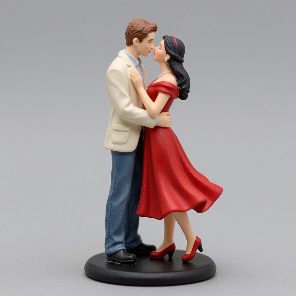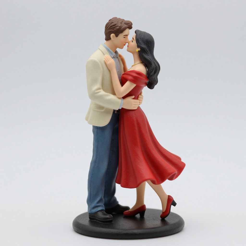 Photograph of a detailed, painted porcelain figurine depicting a couple kissing. The man, with short brown hair, wears a cream-colored blazer, white shirt, and blue jeans. The woman, with black hair and a red headband, dons an off-the-shoulder red dress and red high heels. She stands on tiptoe, embracing the man, who holds her waist. Both figures stand on a black circular base against a plain, light gray background, emphasizing their romantic pose and vibrant colors.