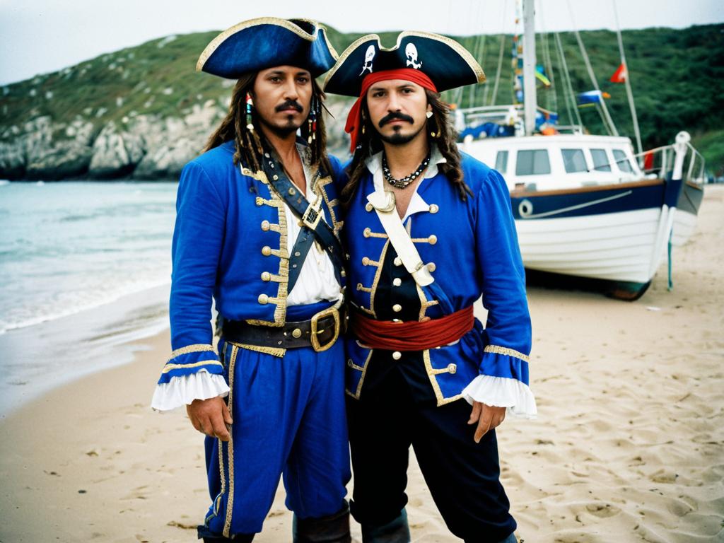 Pirates Fancy Dress face swap, pirate in a blue outfit standing on a beach next to a boat