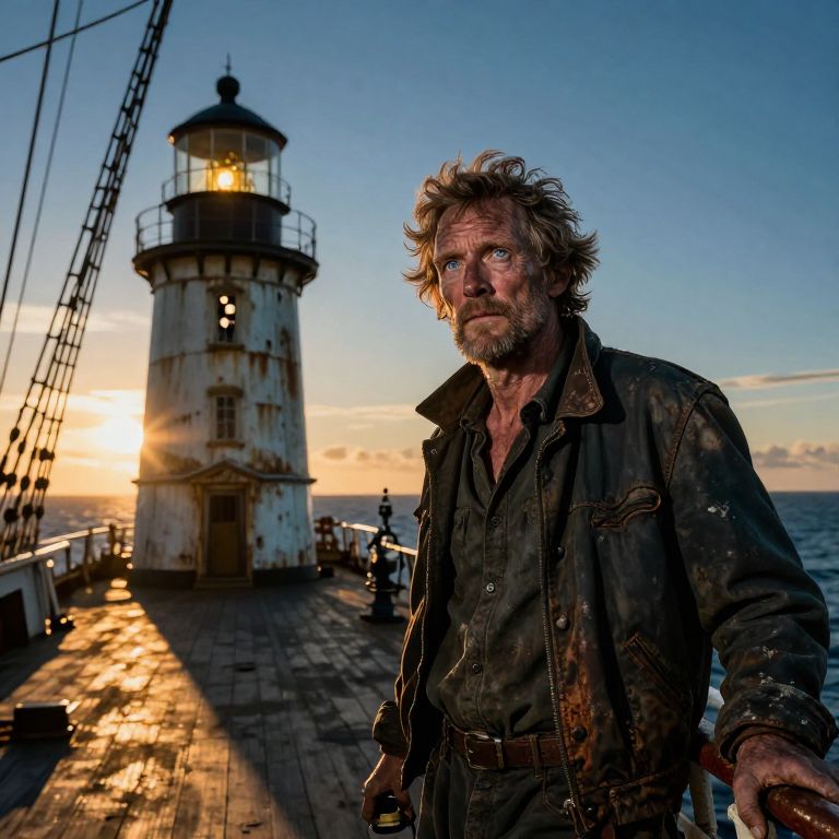 Photograph of a rugged, middle-aged man with tousled blond hair and a beard, wearing a dirty, dark brown, button-up shirt. He has a weathered, determined expression, standing on a wooden deck of a ship at sunset. Behind him is a tall, white, lighthouse with a black top, illuminated by warm light. The sun is low on the horizon, casting a golden glow across the deck and water. The sky is a gradient of blue to orange. The ship's rigging is visible on the left, and the ocean stretches out in the background. The overall mood is dramatic and adventurous.