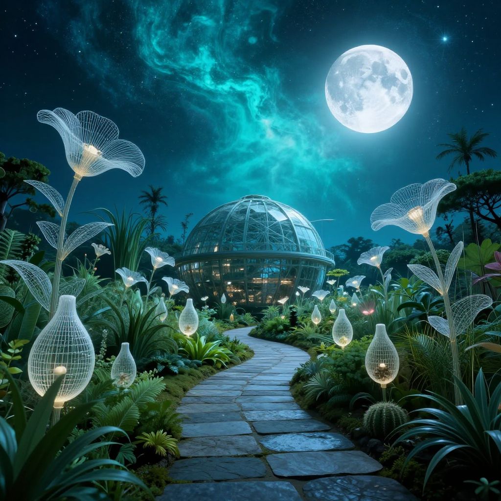 A digital artwork depicting a moonlit garden with a glowing full moon in a starry, turquoise sky. A glass dome building with lit windows is centered in the background. A stone pathway leads through a lush garden of green plants and illuminated wireframe flowers. The wireframe flowers, resembling large, glowing fungi, are scattered along the path, casting a soft light. The scene is serene, with a mix of natural and artificial light, creating a magical, otherworldly atmosphere.