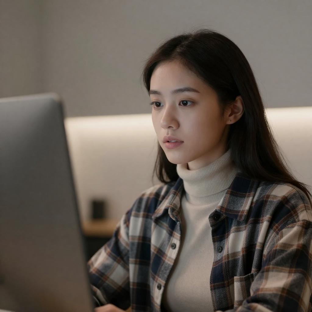 Portrait of a young Asian woman with short dark hair wearing a gray t-shirt, sitting indoors in a dimly lit room. She has an intense, neutral facial expression and is looking slightly to the right. In the background, there is a metal bed frame with a blue sheet and a red dresser with a lamp and folded clothes.