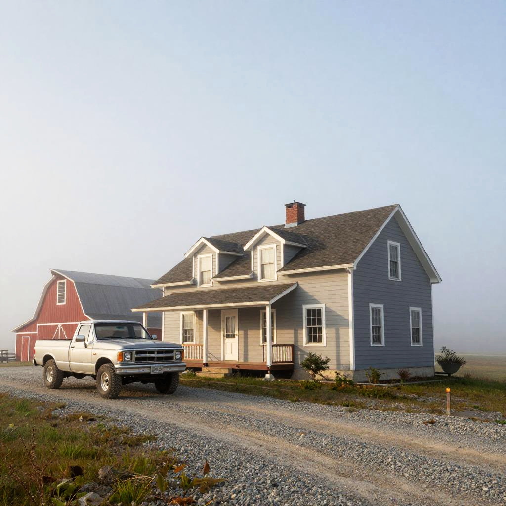 Sprawling grey ranch house with red barn in the background, gravel driveway, vintage pickup truck parked outside, early morning mist creating a serene atmosphere