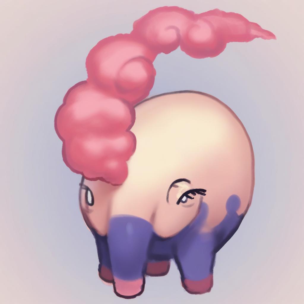 Digital illustration of a whimsical, fantasy creature with a round, pale pink body, dark blue legs, and pink hooves. It has a large, fluffy pink curl on its head, resembling a cloud or smoke. The creature's eyes are small, black, and slightly mischievous, peeking from its head. The background is a soft gradient of light blue. The creature's texture is smooth and slightly glossy, with a playful, cartoonish style. The overall image has a light-hearted, imaginative feel.