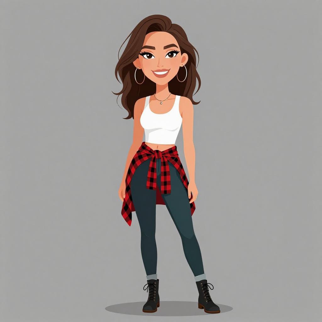 Digital illustration of a smiling woman with medium-length brown hair, wearing a white long-sleeve crop top, black leather skirt, black ankle boots,