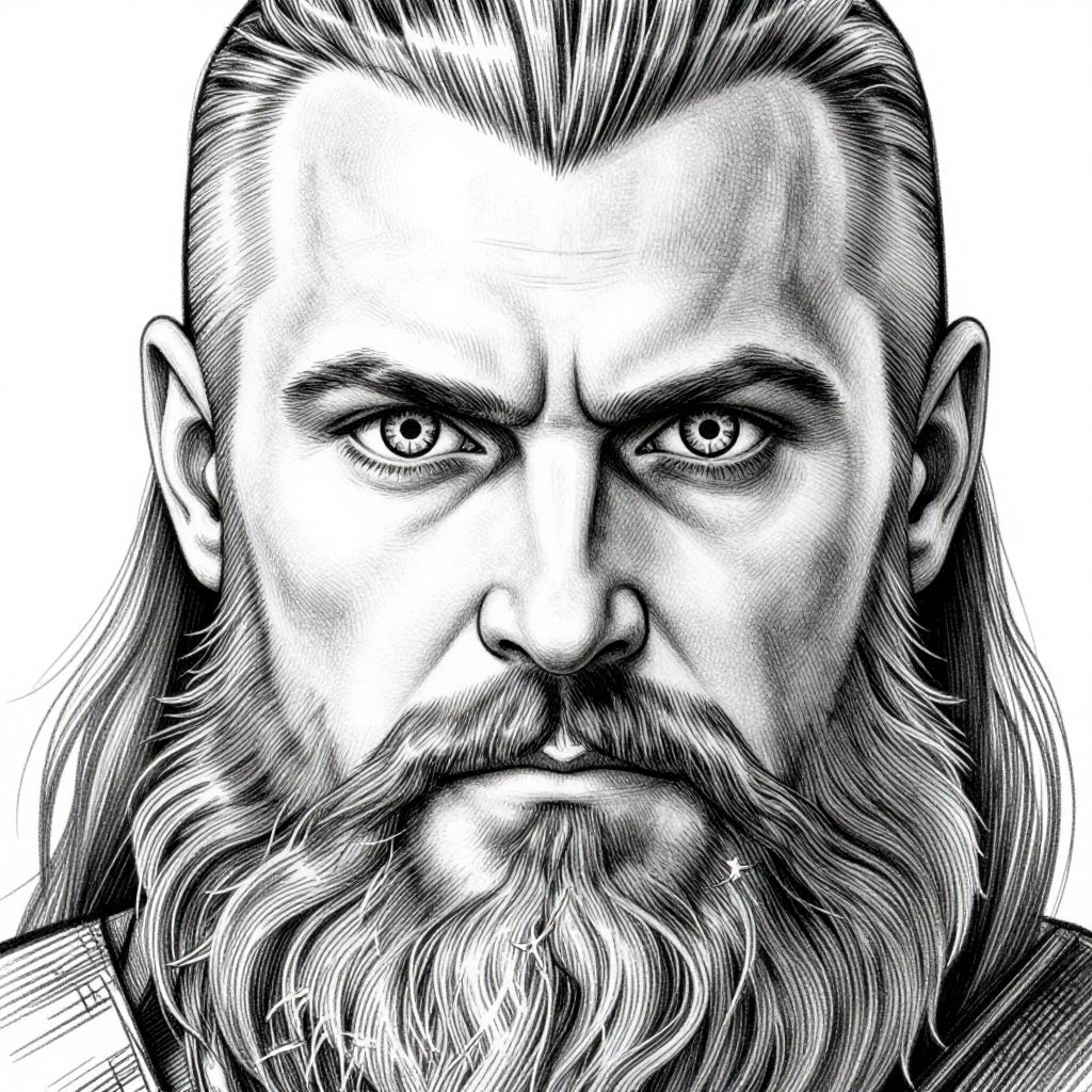 The image presents a striking close-up of a viking man, his face adorned with intricate details. His beard, thick and full, frames his face, while a patch of hair rests atop his head, suggesting a helmet or headgear. The man's eyes are intense and piercing, framed by a Vegvisir, a magical compass symbol, which adds a mystical element to his appearance. The image is rendered in black and white, emphasizing the textures and lines that define his features. The strong lines and shadows create a sense of depth and realism, highlighting the ruggedness and strength of his visage. The overall composition is tightly focused on the man's face, with no extraneous elements, allowing the viewer to fully appreciate the detailed drawing and the interplay of light and shadow that bring his features to life.