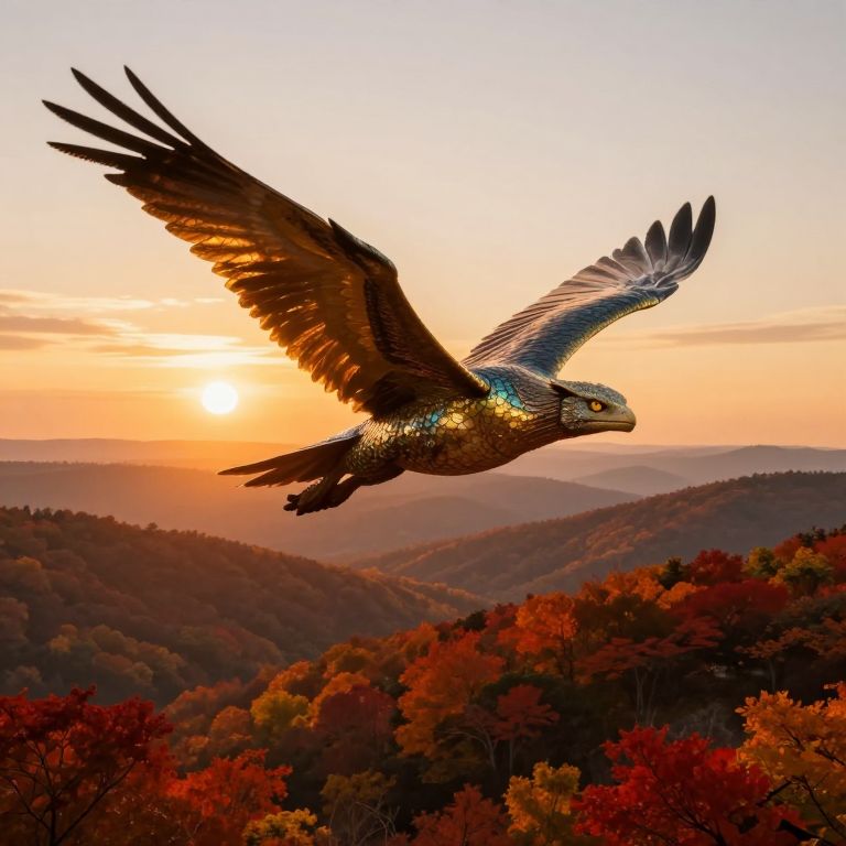 A majestic creature with iridescent scales glides through an autumn sky, its form capturing the golden hues of the setting sun in a photorealistic style akin to imaginative landscapes. From an elevated perspective, witness this awe-inspiring being as it traverses over rolling hills adorned with vibrant red and orange foliage, juxtaposing ancient mythical grandeur against nature's tranquil serenity. Emphasize the powerful wings extended during flight, its piercing gaze fixed upon a distant horizon that glows with the warmth of twilight, evoking wonder, mystery, and respect for both the grandeur of the natural world and the enduring mythos surrounding this enigmatic beast.
