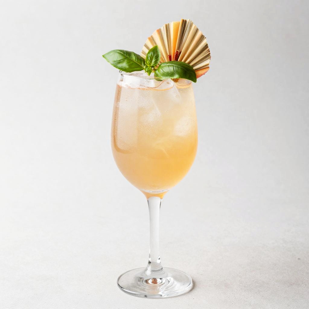 A icy peach basil spritzer in a slender pilsner glass, garnished with peach fan and fresh basil leaf. This artistic representation features bright colors and a minimalistic design, creating an inviting atmosphere for a refreshing summer drink.