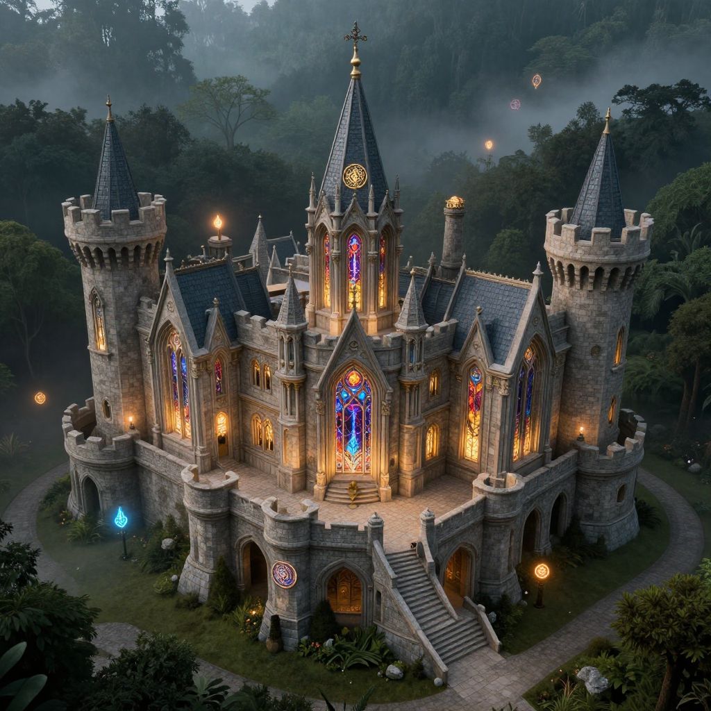 Photorealistic CGI of a medieval-style castle with ornate stained glass windows, illuminated by warm lights, surrounded by misty forest.