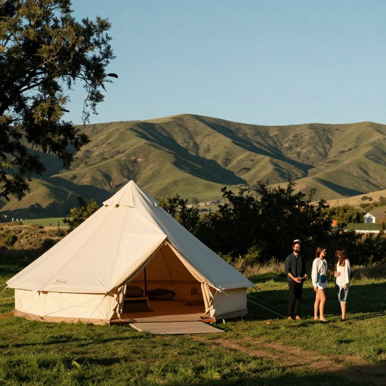 Photograph of a camping scene in a grassy field with rolling green hills in the background. A beige canvas tent with a wooden floor is pitched on the left, partially shaded by a tree. Three people stand to the right of the tent; a man in a blue shirt and shorts, a woman in a white dress, and another person partially visible. The clear blue sky contrasts with the lush, sunlit landscape. Shadows from the tree and tent create a dappled light effect on the grass.