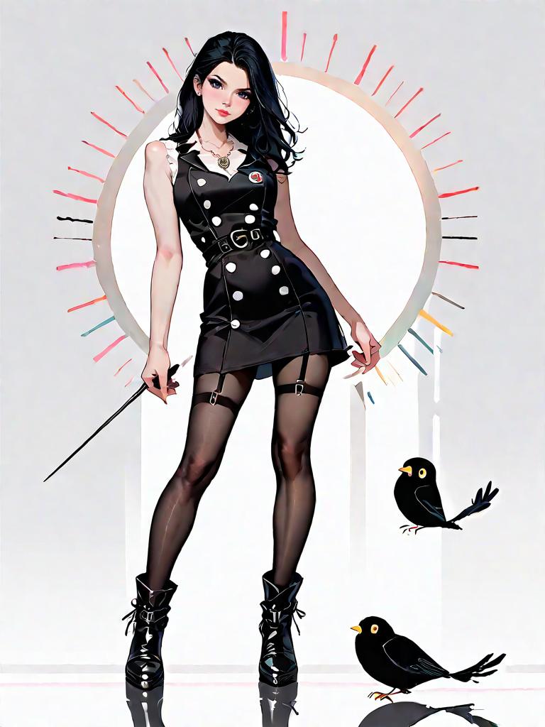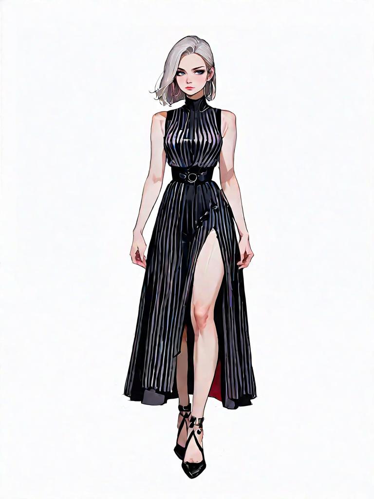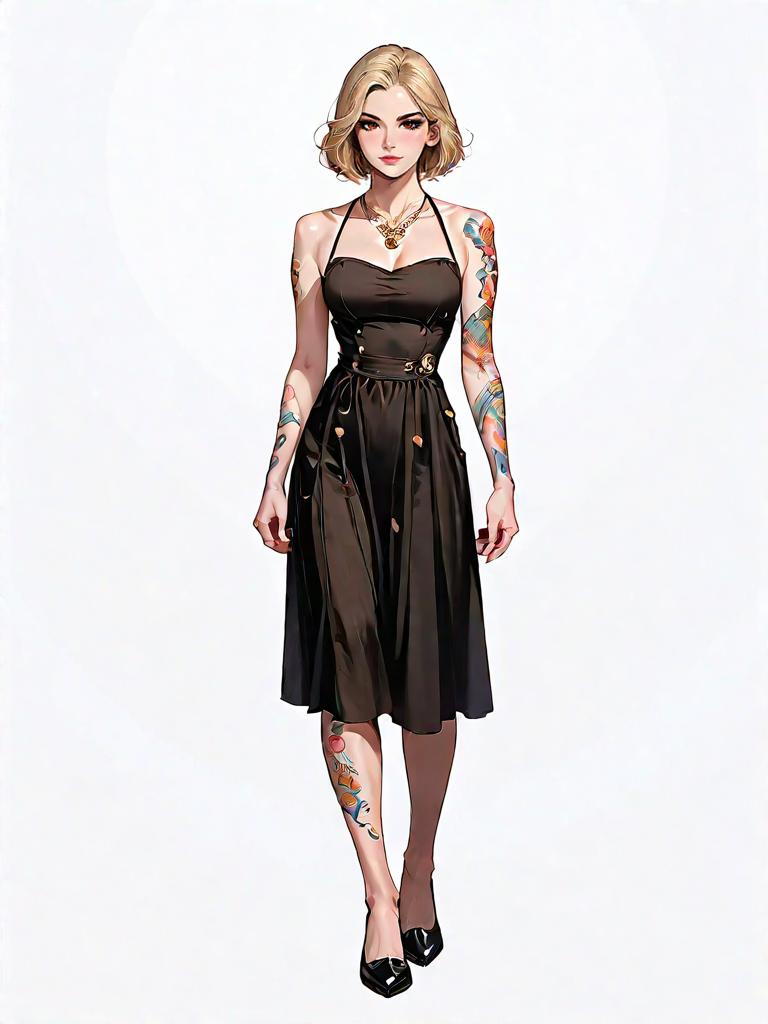 1girl, source_comics, realistic face, full body shot, Woman, minimalist chic, fitted black tank dress, scoop neckline, thin straps, ribbed texture, midi length, flat strappy sandals, neutral studio background.