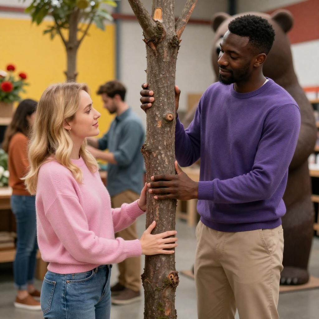 Photograph of a woman with short, wavy blonde hair in a blue jacket gently touching the shoulder of a man with dark skin and short black hair, wearing a brown shirt. They stand outdoors with blurred autumn trees in the background, looking at each other intently.
