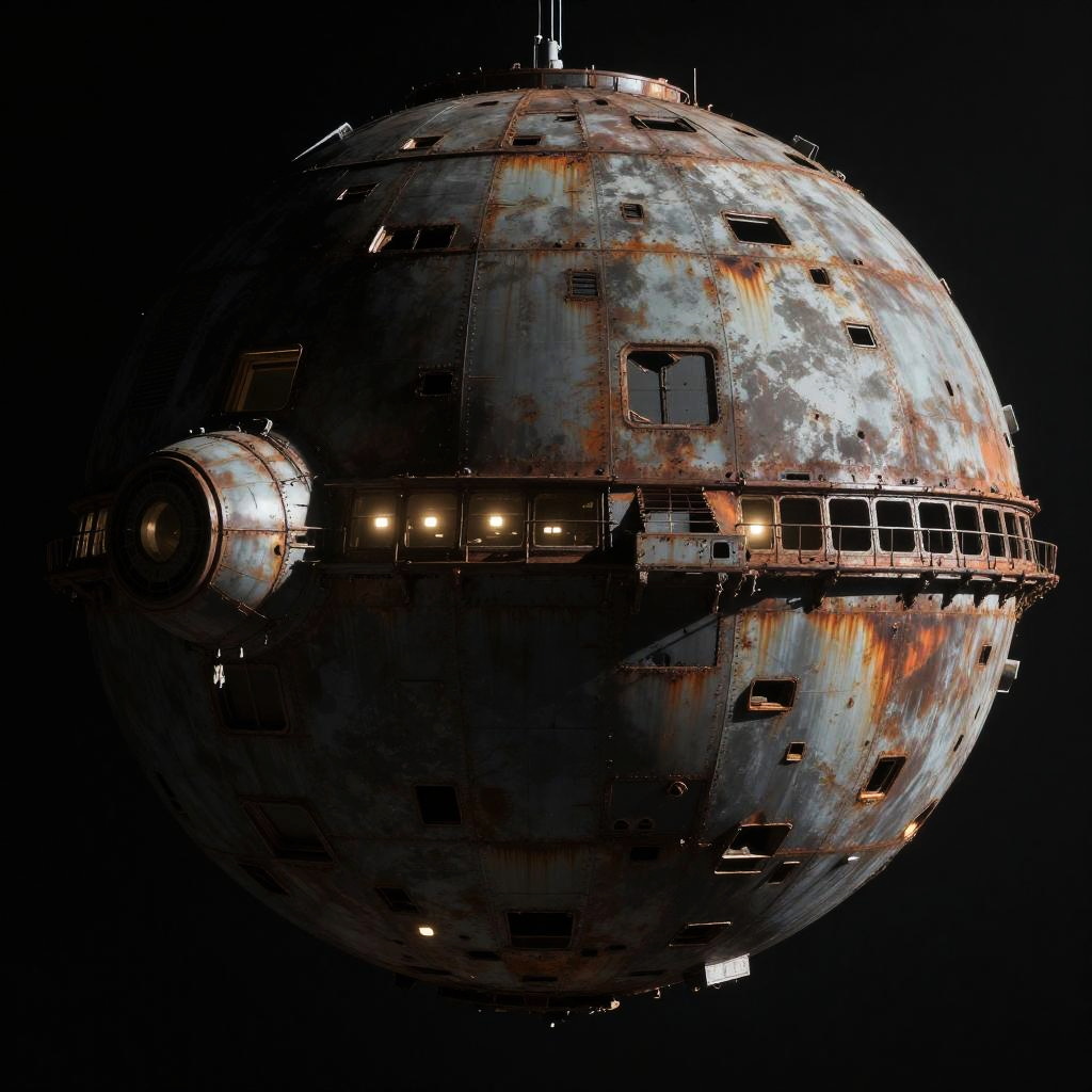 Abandoned space station orbiting a desolate planet, rusty metal surfaces, flickering lights inside, dark and moody atmosphere, cinematic lighting, sci-fi concept art